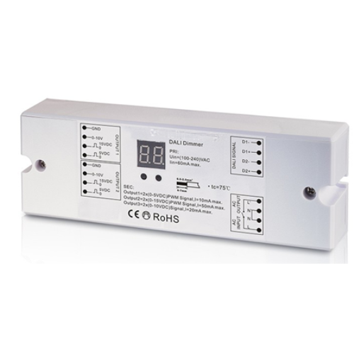 Convert from DALI to 0-10V output, this unit features two separate 0/1-10v channels and a single relay for switching power if needed. Both channels are controlled by a single DALI address simultaneously.